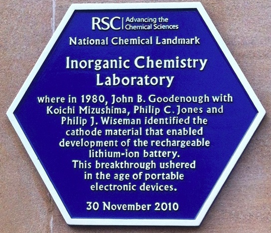 英國(guó)皇家化學(xué)會(huì)在牛津設(shè)立的藍(lán)色牌匾,以紀(jì)念在此為可充電電池作出的偉大貢獻(xiàn),古迪納夫的名字赫然在列 圖片來(lái)源:網(wǎng)絡(luò)