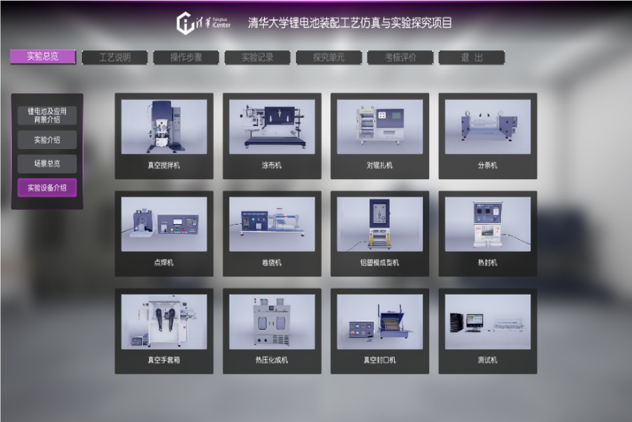 清華大學(xué)鋰電池裝配教學(xué),是新能源領(lǐng)域的前沿技術(shù)向示范性教學(xué)轉(zhuǎn)變的一次探索。實(shí)驗(yàn)選擇軟包鋰電池作為對(duì)象,教學(xué)有兩個(gè)特點(diǎn):(1)軟包鋰電池制備的真實(shí)性。軟包鋰電池生產(chǎn)線(xiàn),按照中試生產(chǎn)規(guī)模購(gòu)置。電池生產(chǎn)流程與工廠電池制備流程一致,保證了學(xué)生可以近距離、真實(shí)了解軟包鋰電池的生產(chǎn)過(guò)程。(2)軟包鋰電池的制備可以與新能源材料和新技術(shù)的引進(jìn)相結(jié)合,鼓勵(lì)學(xué)生提出自己的理解、大膽創(chuàng)新。然而,軟包鋰電池裝配的教學(xué)工作也存在以下問(wèn)題:(1)軟包鋰電池的制備過(guò)程包括涂極片、電芯組裝、注液、化成、性能測(cè)試等十余道工序,影響電池性能的工藝參數(shù)多達(dá)上百余個(gè)。由于裝配過(guò)程復(fù)雜,在現(xiàn)場(chǎng)實(shí)驗(yàn)中,難以保證學(xué)生對(duì)相關(guān)流程的有效掌握,存在操作不當(dāng)所帶來(lái)的安全和設(shè)備損壞風(fēng)險(xiǎn),以及耗材損耗嚴(yán)重等問(wèn)題。(2)軟包鋰電池的制備過(guò)程對(duì)耗材的使用量大,且成本較高。如果不能準(zhǔn)確掌握軟包鋰電池的制備工序,會(huì)直接影響最終產(chǎn)品的性能,造成不必要的浪費(fèi)。(3)新能源材料和新技術(shù)的引進(jìn)有助于進(jìn)一步提高軟包鋰電池的性能,其效果的實(shí)現(xiàn)需要反復(fù)的實(shí)驗(yàn)、數(shù)據(jù)記錄及驗(yàn)證,實(shí)際應(yīng)用的成本昂貴。因而,借助虛擬仿真教學(xué)系統(tǒng),學(xué)生可以掌握軟包鋰電池裝配及設(shè)備操作流程,學(xué)習(xí)相關(guān)知識(shí)點(diǎn),開(kāi)放探究思考;在此基礎(chǔ)上開(kāi)展實(shí)操,并在系統(tǒng)中記錄現(xiàn)場(chǎng)實(shí)驗(yàn)數(shù)據(jù),形成虛擬仿真及現(xiàn)場(chǎng)實(shí)訓(xùn)相結(jié)合的教學(xué)模式。