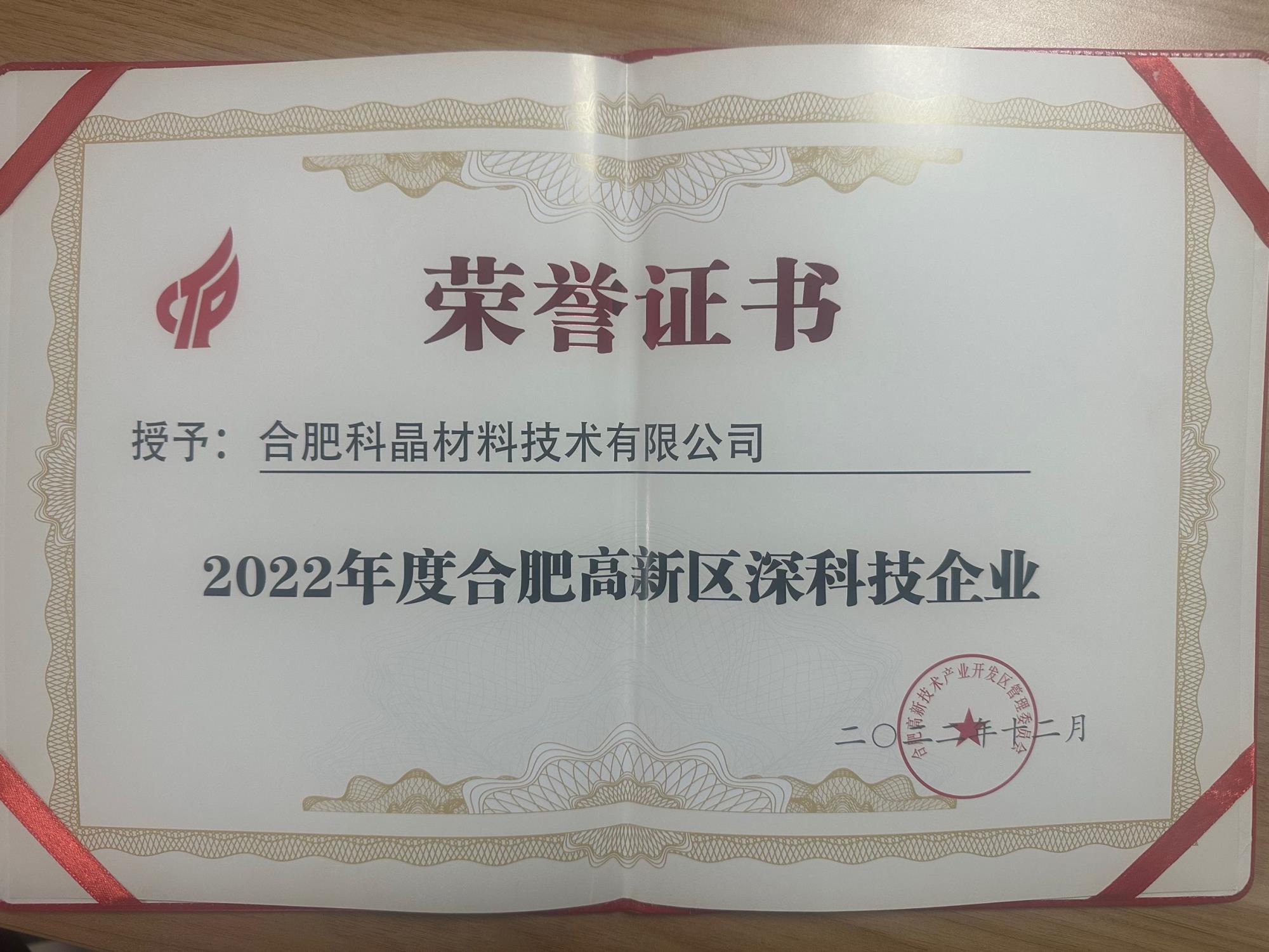 喜報(bào)/恭賀我司榮獲2022年度合肥高新區(qū)深科技企業(yè)