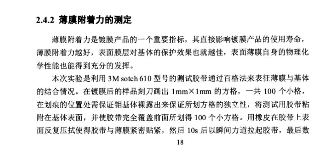 結(jié)果分析:使用3M膠帶粘黏劃破后的薄膜,發(fā)現(xiàn)破口附近無(wú)薄膜脫落,說(shuō)明膜結(jié)合力良好。無(wú)水乙醇擦拭前后,鉬薄膜無(wú)變化,說(shuō)明膜表面致密性優(yōu)良,附著力較強(qiáng)。