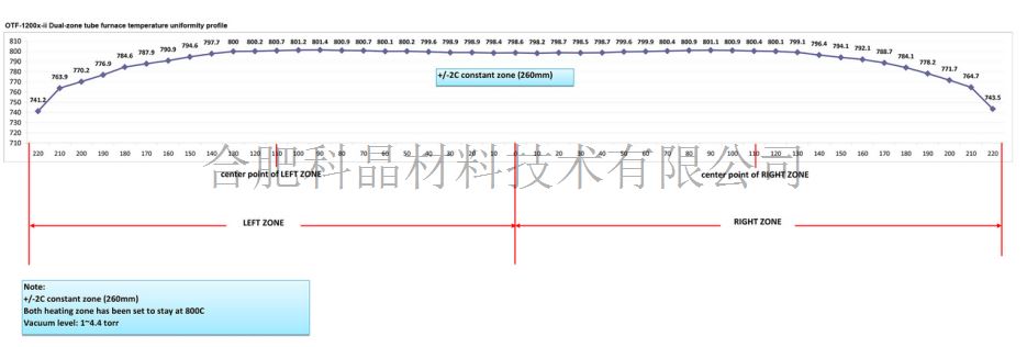雙溫區(qū)管式爐:兩個(gè)獨(dú)立的溫控系統(tǒng)對(duì)每個(gè)溫區(qū)進(jìn)行獨(dú)立控溫 電壓:220V AC 50/60Hz 功率:3KW 加熱區(qū)長(zhǎng)度:440mm 恒溫區(qū)長(zhǎng)度:300mm 溫度曲線圖(兩個(gè)溫區(qū)設(shè)置在800℃時(shí)所測(cè),僅供參考)(可點(diǎn)擊圖片查看詳細(xì)資料)