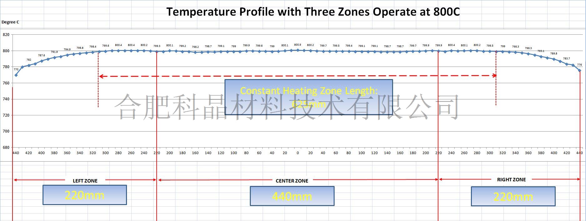 三個(gè)加熱溫區(qū)總長(zhǎng): 900mm(36") 溫區(qū) 1: 229mm (9") 溫區(qū)2: 457mm (18.0") 溫區(qū)3: 229 mm (9") 恒溫區(qū):625mm(三個(gè)溫區(qū)設(shè)置同樣的溫度) 注:由于測(cè)量手段及外部環(huán)境的影響,測(cè)量結(jié)果可能會(huì)有偏差,此參數(shù)僅供參考不作為該設(shè)備的技術(shù)指標(biāo)。您購(gòu)買產(chǎn)品需要準(zhǔn)確的恒溫區(qū)數(shù)據(jù),請(qǐng)與我公司銷售人員聯(lián)系 恒溫精度: +/- 1°C 三個(gè)溫區(qū)采用PID50段程序化獨(dú)立控制 控溫精度: +/- 1° C 最高工作溫度:1200℃ 連續(xù)使用溫度:1100℃ 推薦升溫速率: <= 20°C /min