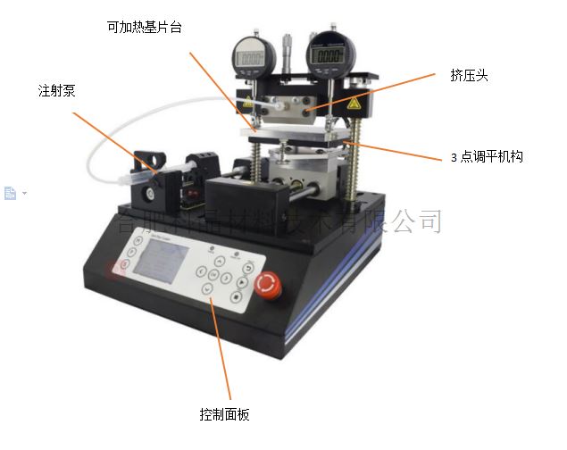 | 產(chǎn)品特點 | ? 設備尺寸較小(360 mmL x 280 mmW x 190 mmH),特別適合與實驗室使用,可放置于手套箱或通風柜中實驗 ? 設備安裝使用方便,接上電源即可使用,無需壓縮空氣和真空泵配套 ? 涂覆精度高:采用防腐型不銹鋼擠壓頭,涂覆精度高達1um ? 用戶可更換擠壓頭中墊片,改變通道厚度, ? 可控溫型基片臺,最高溫度可達120℃,基片臺由電機驅(qū)動移動,移動速度為1mm/m-3000mm/m |