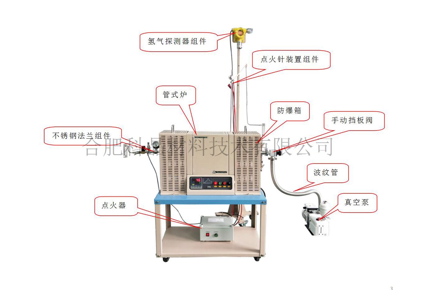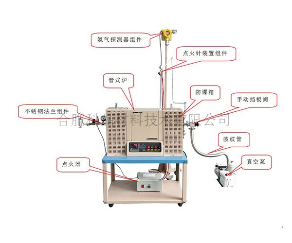 | 進氣和出氣系統(tǒng) | ·進氣端安裝有一個浮子流量計和進氣電磁閥,當檢測系統(tǒng)檢測到氫氣泄露時將自動關(guān)閉進氣電磁閥。同時出氣端安裝有一個電子點火器,用于對氫氣燒結(jié)進行電子點火; ·出氣端安裝有一個浮子流量計,浮子流量計量程0.2-2L/min ·爐管兩端漏出爐子部分,安裝有防爆網(wǎng) |