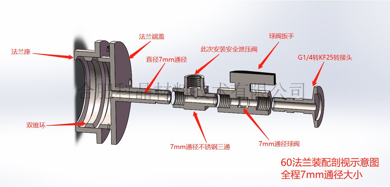 | 法蘭尺寸 | ·Φ60標準尺寸,適應(yīng)于φ60石英及剛玉爐管 ·法蘭端蓋伸出52mm并配有G1/4接口 ·配有G1/4大通徑不銹鋼三通 ·球閥總長50mm ·KF轉(zhuǎn)接真空接口總長43mm ·法蘭裝配總長195mm |