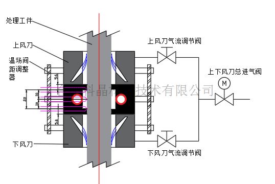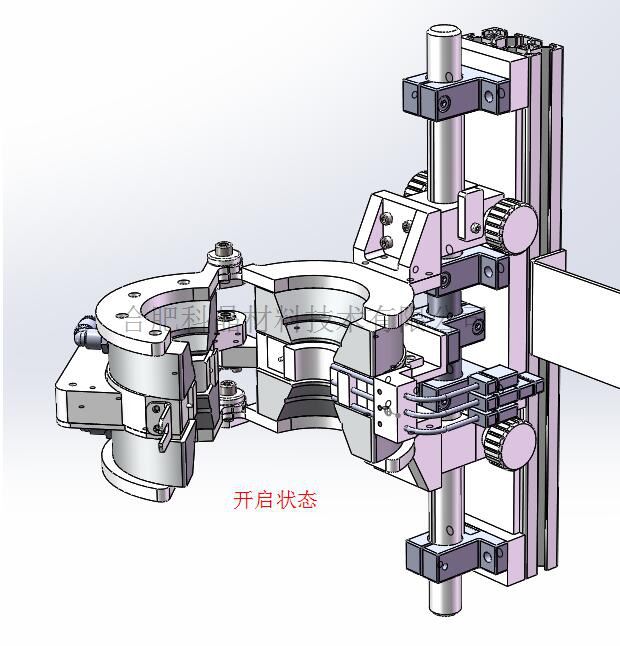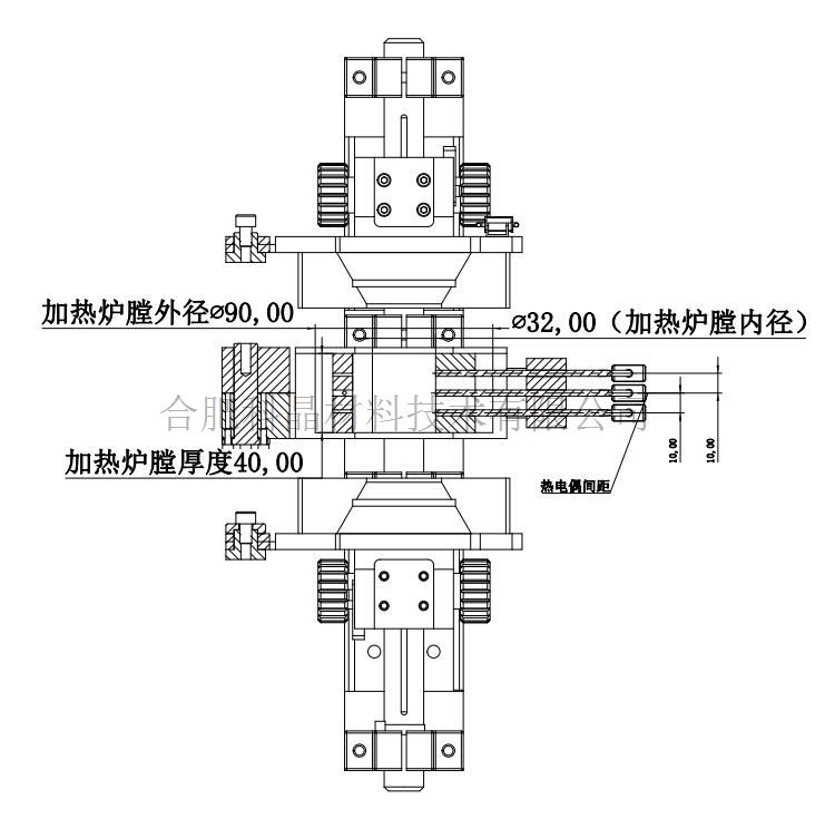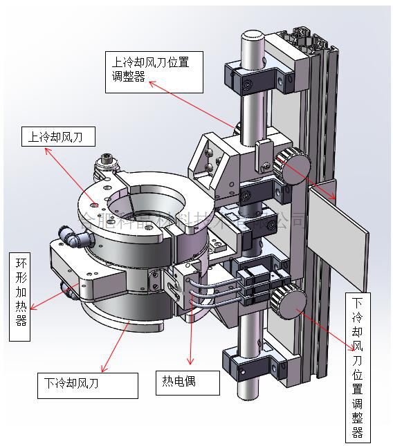 ·加熱系統(tǒng)由環(huán)形加熱器,控溫?zé)犭娮瑁舷聹y溫?zé)犭娮?,上下冷卻風(fēng)刀, 冷卻風(fēng)刀位置調(diào)整器組成 ·環(huán)形加熱器外徑90mm,內(nèi)徑32mm 高度40mm如下圖 ·區(qū)熔加熱環(huán),上下風(fēng)刀,固定在高精度直線模組上,可以實現(xiàn)上下移動 ·區(qū)熔加熱模組中的加熱器有2個對半開啟的加熱環(huán)和3根pt100型熱電阻組成,熱電阻的間距為10mm,(上下2根為測溫)如下圖 ·通過上下風(fēng)到相對加熱環(huán)的間距可調(diào),實現(xiàn)距離和風(fēng)量兩個可變指標(biāo)來對溫度梯度的調(diào)整空間, 實現(xiàn)10mm的溫度差50℃指標(biāo),采用微調(diào)閥控制壓縮氣的流量來控制風(fēng)刀氣流大小。 ·風(fēng)刀和環(huán)形加熱器均可以開啟,采用鉸鏈?zhǔn)介_啟連接,卡扣式鎖緊如下圖