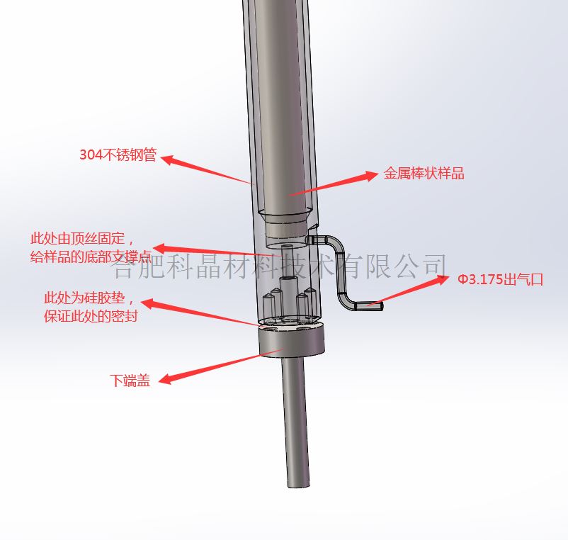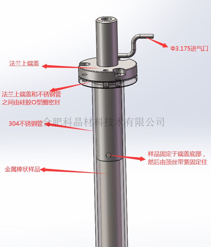 ·外徑24mm內(nèi)經(jīng) 20mm 304不銹鋼管(可以根據(jù)客戶要求選配高純石英管,更直觀看到樣品在管內(nèi)狀態(tài),也可以選配樣品帶旋轉(zhuǎn)功能) ·加熱管上預(yù)留1/8英寸進氣和出氣口 ·法蘭頂部有不銹鋼夾具,用于安裝棒金屬樣品如下圖