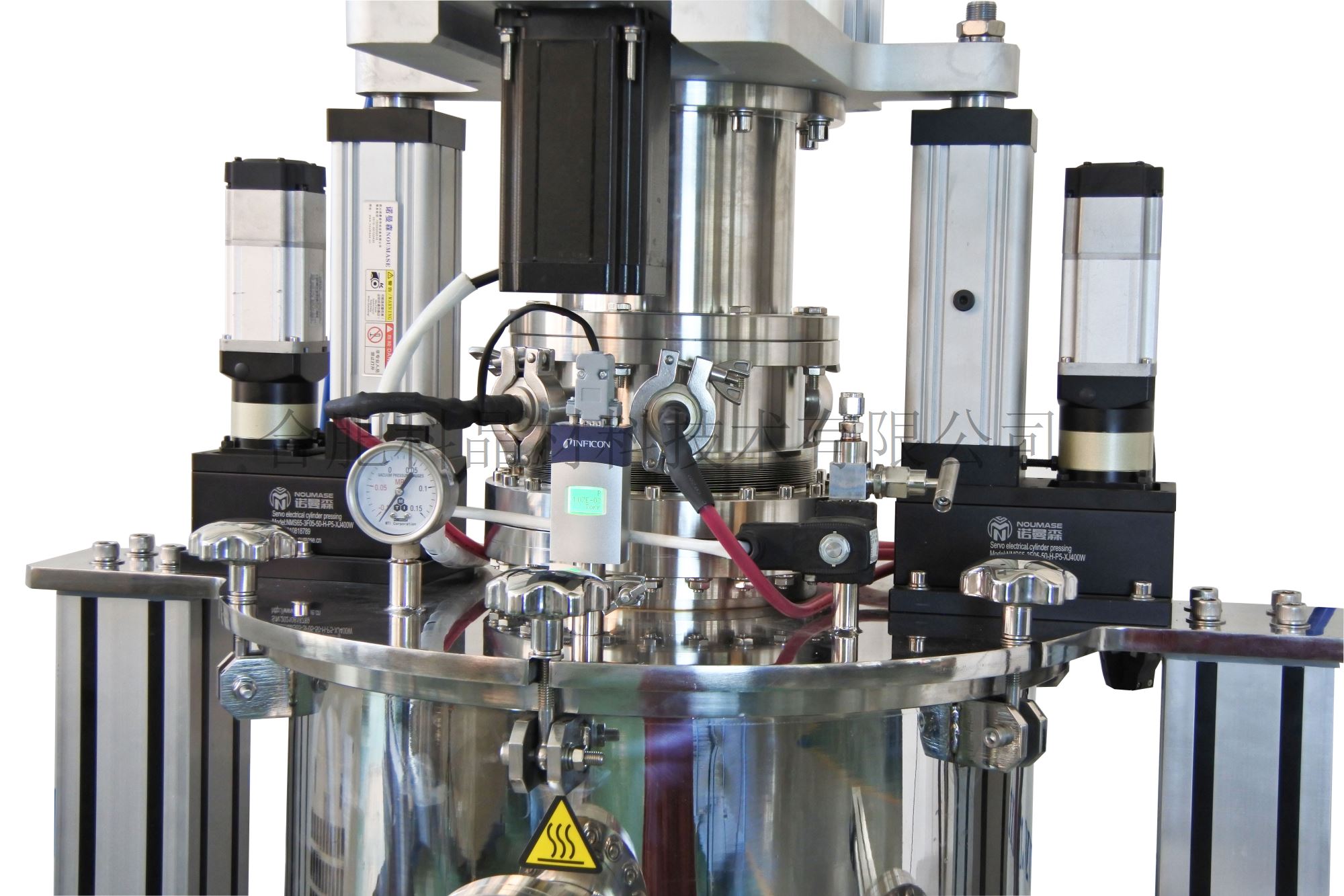 | 不銹鋼密封法蘭系統(tǒng)+加熱平臺(tái) | ·不銹鋼密封法蘭,法蘭和加熱爐腔之間采用硅膠O型圈壓緊方式密封。 ·上法蘭開啟和關(guān)閉才用電動(dòng)方式,由兩個(gè)同步升降立柱執(zhí)行,用PC機(jī)進(jìn)行控制 ·上法蘭裝有機(jī)械壓力表和數(shù)顯真空計(jì),留有G1/4出氣口,KF25真空電極接口 ·上法蘭連接有壓縮波紋管上加熱臺(tái)可以在真空或氣氛下上下移動(dòng),調(diào)節(jié)上下加熱臺(tái)距離,調(diào)節(jié)上下加熱區(qū)的溫差,上加熱臺(tái)移動(dòng)移動(dòng)范圍:0-25mm ·上法蘭連接有磁流體+電滑環(huán)+水滑環(huán)進(jìn)行動(dòng)密封,上加熱臺(tái)通過步進(jìn)電機(jī)進(jìn)行旋轉(zhuǎn),旋轉(zhuǎn)速度可調(diào)范圍:1-10r/min ·下法蘭留有KF25真空電極接口和G1/4進(jìn)氣口 ·上下加熱平臺(tái)采用圓形需要水冷,兩組紅外燈管在加熱平臺(tái)內(nèi)呈井字型排列,使加熱溫場更加均勻。 ·樣品支架分別安裝在上下加熱臺(tái)上。 |