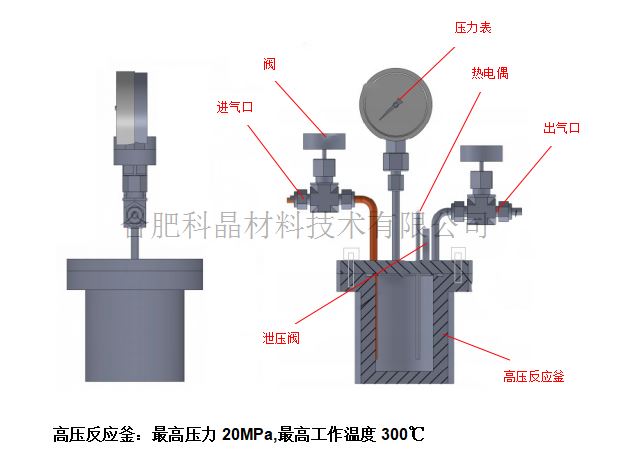 | 高壓反應釜 | ·材質:SS316L不銹鋼 ·反應釜尺寸:3種尺寸可選 1、內徑12×高度27(cm),3L容積 2、內徑15×高度30(cm),5L容積 3、內徑18×高度40(cm),10L容積 ·安裝有泄壓閥 壓力表,進氣接口,出氣閥 安裝有2個K型熱電偶:一個用于控制爐體溫度,另一個用于測量反應釜內部溫度 ·最大工作壓力20MPa,工作溫度:室溫~300℃ |