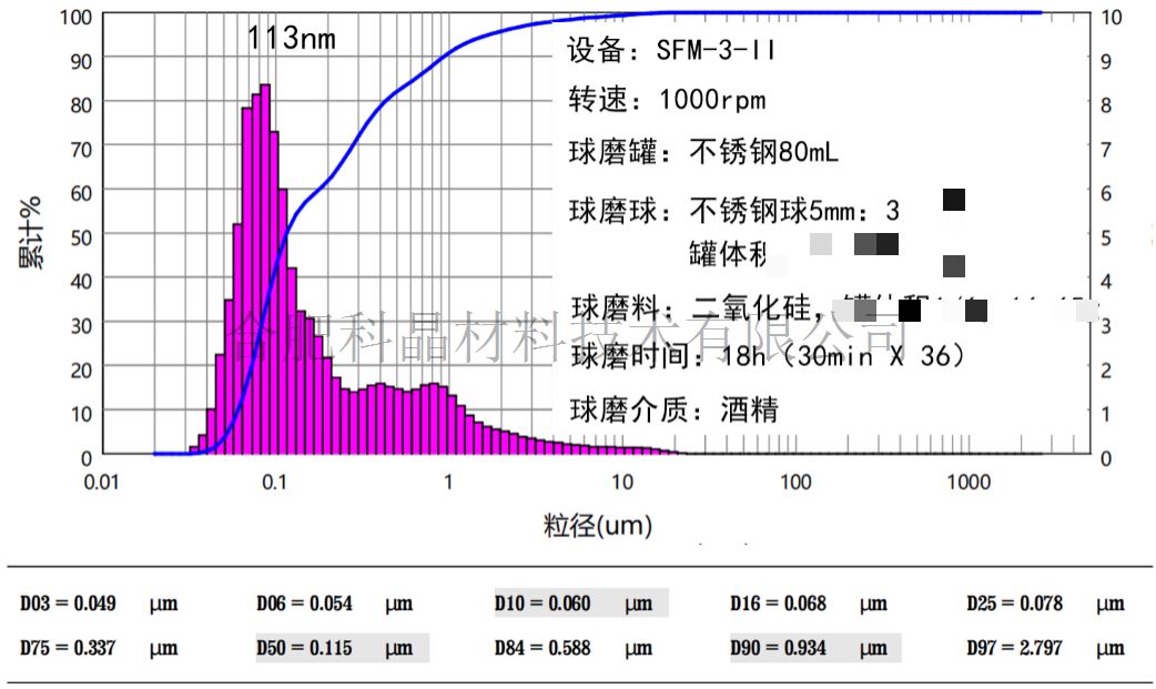 ![]() | ![]() | 物質(zhì):二氧化硅 物料重量:16.65g 研磨罐材質(zhì):不銹鋼罐 研磨罐容積:80ML 研磨方式:濕磨 | 選用設(shè)備:SFM-3-II 研磨時(shí)間:18小時(shí) 轉(zhuǎn)速:1000rpm 細(xì)度:113納米 |