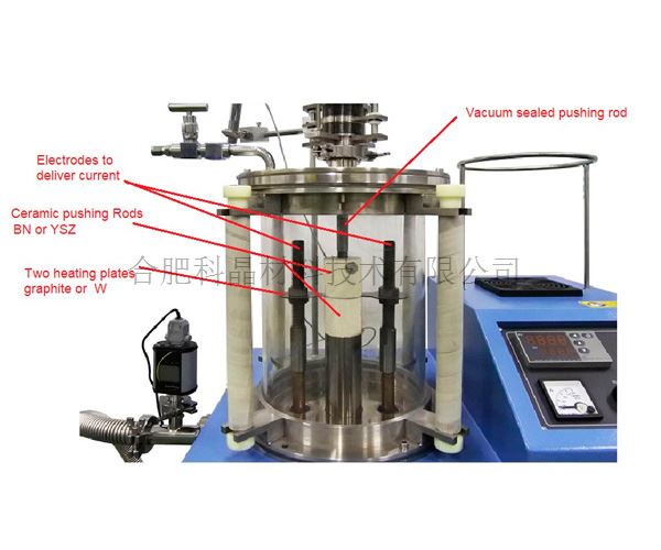 | 真空腔室 | · 材質(zhì):高純石英 · 尺寸:外徑φ216*內(nèi)徑φ206*L300mm · 一個(gè)不銹鋼網(wǎng)罩住整個(gè)石英腔體 · 腔體上下兩端安裝了一對(duì)不銹鋼密封法蘭,上下法蘭之間利用膠木輥支撐。 · 一個(gè)不銹鋼法蘭蓋安裝在上法蘭上。KF40的接口上安裝了一根可伸縮波紋管,波紋管頂部安裝的連接板用于調(diào)節(jié)壓力 · 紅外測(cè)溫儀通過法蘭蓋上一個(gè)φ35mm觀察窗探測(cè)樣品的溫度 · 兩個(gè)φ6.35的卡套接頭,一個(gè)用于通入惰性氣體,一個(gè)用于排氣。進(jìn)氣口通過設(shè)備左側(cè)的精密調(diào)節(jié)閥控制進(jìn)氣流量,排氣口通過不銹鋼針閥控制通斷; · 兩根M18的陶封電極安裝在底部法蘭上,石墨片安裝在電極支撐柱上,樣品放置在兩塊石墨片之間。石墨片上下兩端的壓緊塊通過上下擠壓的方式對(duì)樣品施加壓力。 |