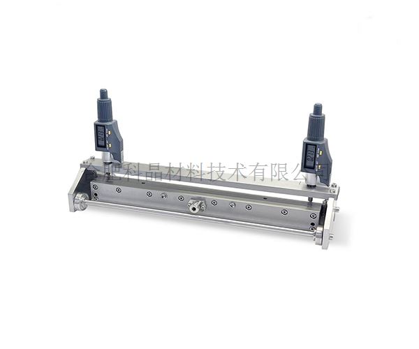 ·一個(gè)500mm寬的擠壓頭安裝在一個(gè)可移動(dòng)的支架上,支架底部安裝有4個(gè)精密滾輪 ·涂布機(jī)推桿推動(dòng)移動(dòng)支架和擠壓頭在涂布機(jī)的真空平板上移動(dòng),將漿料均勻涂布在基底上, 而且移動(dòng)支架和擠壓頭都不接觸基底 ·擠壓頭與基底之間的間隙通過兩個(gè)數(shù)顯千分表調(diào)節(jié),數(shù)顯千分表精度為±1um ·配有2套不銹鋼墊片,3種不同厚度0.2mm,0.3mm和0.4mm