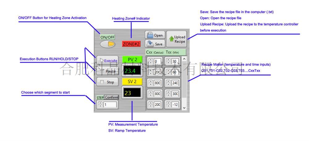 | 操作界面 | ·溫度曲線可允許創(chuàng)建自定義的溫度配方,控制不同的流程,比如:運(yùn)行、保持、停止、跳躍步驟、配方制作、PV和SV顯示、溫度。(詳情見圖1); ·可以對1~3個加熱區(qū)的設(shè)備進(jìn)行溫度編程和監(jiān)控。(詳情見圖2); ·實時圖表繪制(Y軸:溫度;X軸:時間)。允許保存圖表(.png文件)和清除歷史記錄。(詳情見圖3); ·一旦激活“數(shù)據(jù)記錄”功能,就會繼續(xù)記錄測量溫度和時間的數(shù)據(jù)(.CSV文件)??梢允褂肕S Excel訪問CSV文件。(詳情見圖4); ·可以將配方保存在.txt文件中以供將來操作需要。(詳見圖5) |