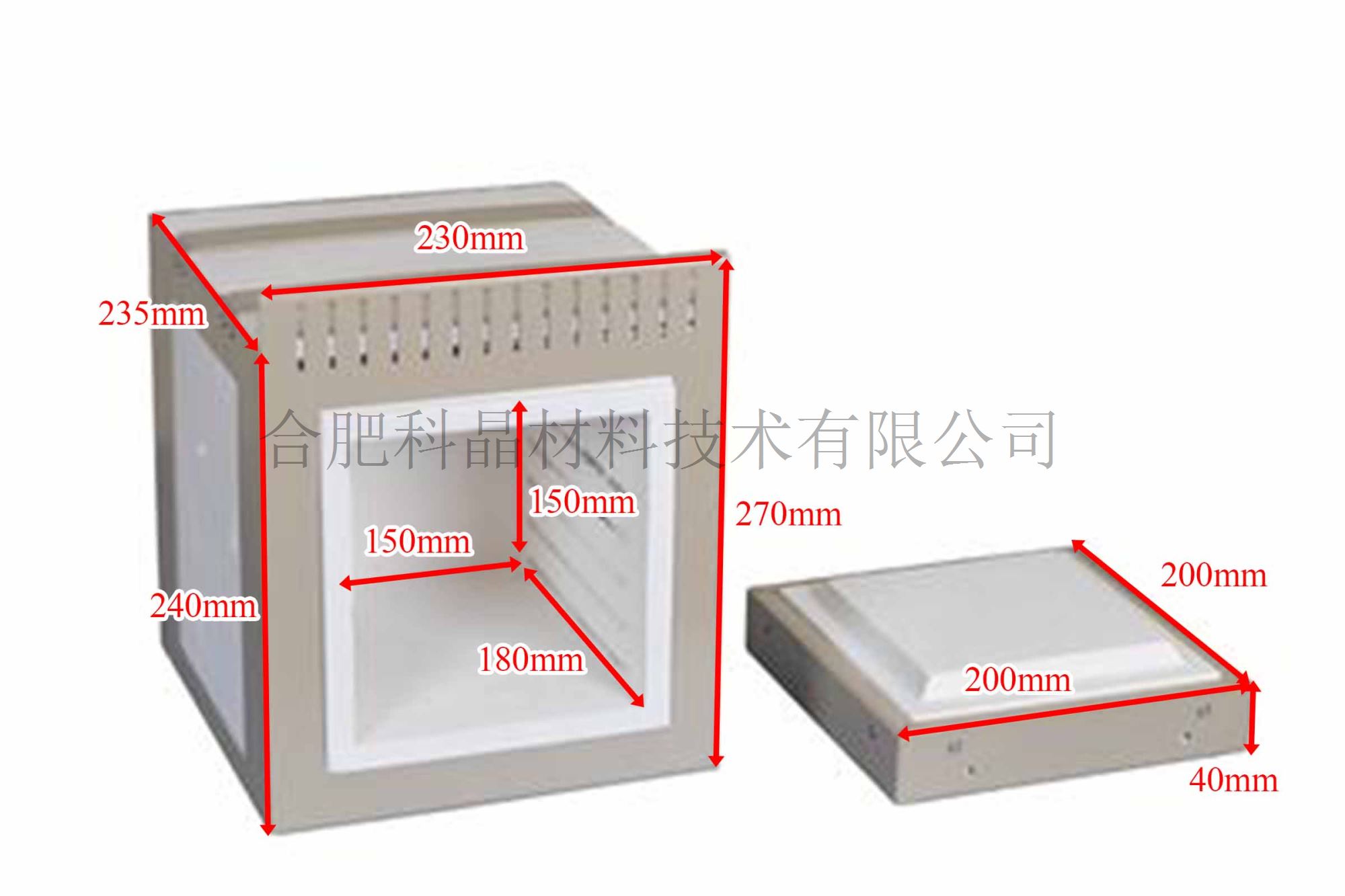 ·材質(zhì):內(nèi)嵌加熱線圈的氧化鋁腔體; ·外部尺寸:240mmD x 230mmW x 270mmH; ·腔內(nèi)尺寸:180mmD x 150mmW x 150mmH; ·腔門尺寸:200mmD x 200mmW x 40mmH ;