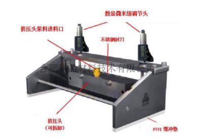 | 制膜器 | ·配有一個250mm寬的微米可調(diào)制膜器,厚度 0.01mm - 5 mm可調(diào)(圖 1) ·配備橫向推桿,用于推動刮刀,確保勻速涂布 ·注意:可實(shí)現(xiàn)的最薄薄膜>10μm ·可選混合制膜器,可實(shí)現(xiàn)擠壓涂布(圖2) 圖1 圖2 |
