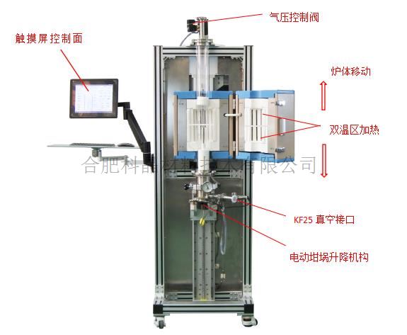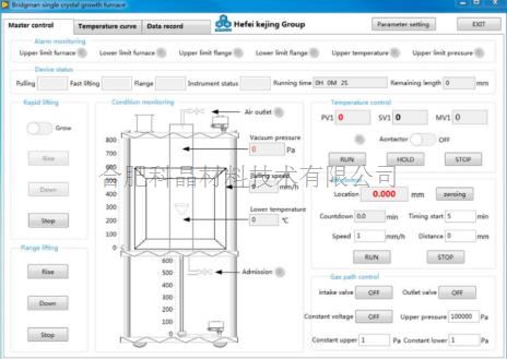 | 控制面板 | ·觸摸屏控制面板可控制爐體移動速度,移動行程和爐體溫度和顯示坩堝的溫度,也可控制爐管內(nèi)部氣壓 ·2個歐陸儀表(Eurothermo)分別控制2個溫區(qū),控溫精度+/-0.1℃ ·包含3根K型熱電偶 2根熱電偶分別控制和檢測2個溫區(qū)的溫度 1根熱電偶用于檢測坩堝底部的溫度 ·坩堝臺與底部法蘭相互連接 ·一個數(shù)顯壓力傳感器和電磁閥安裝在密封法蘭上,用于控制爐管內(nèi)氣壓恒定,控制范圍:0.01MPa-0.02MPa |