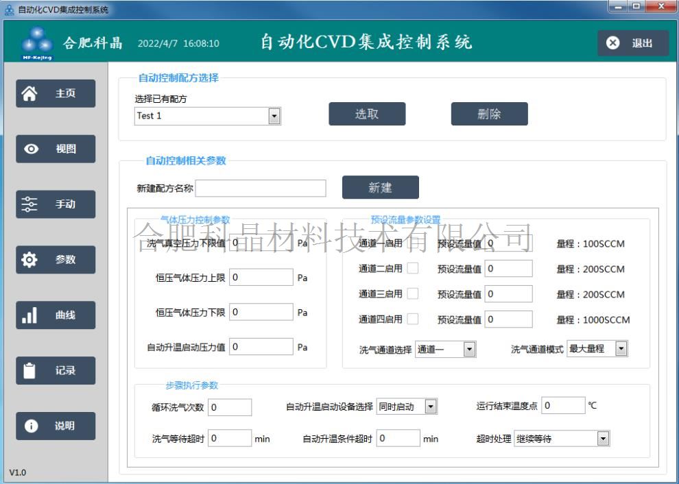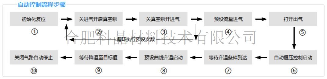 | 軟件控制系統(tǒng) | 1.通過觸控一體機可以手動和自動控制加熱爐系統(tǒng),供氣系統(tǒng),真空系統(tǒng) 2.預(yù)設(shè)工藝自動控制流程步驟如下圖 3.加熱爐溫度,管內(nèi)真空,進氣流量,這些數(shù)據(jù)可以實時記錄。如下圖 4.軟件有工藝曲線自動生成功能,把加熱爐溫度,真空度,進氣流量等參數(shù)進行存儲生成工藝流程,最大可以存儲100條工藝流程,也可以調(diào)出工藝流程一鍵自動運行設(shè)備 |